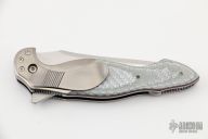This Custom Shark Flipper by Jim Smyth features a hand rubbed satin finished blade with notched thumbrest and flipper. The handle has satin finished dovetailed titanium bolsters, silver twill scales with red liners, satin finished titanium liners and tip down clip, notched and anodized titanium backspacer. Nice detent, lockup and blade seating. Excellent condition.