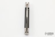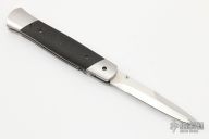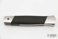 This scale release auto features a two tone blade with satin finish flats and mirror polish grinds, single thumb stud. Fast and smooth action. The handle has satin finished x steel bolsters, front and rear, carbon fiber scales, titanium liners and stainless steel backspacer. Nice detent, lockup and blade seating. The blade has some light scratches and the scales have some small gaps/holes in the carbon fiber. Comes with a nylon velcro sheath. Otherwise good condition.