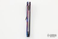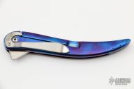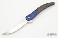 This Framelock Flipper by Jim Smyth features a hand rubbed satin finished blade with notched thumbrest and flipper. The handle has a blued Damascus bolster, carbon fiber scale, anodized titanium frame and tip down clip, black linen micarta backspacer. Nice detent, lockup and blade seating. Excellent condition.