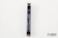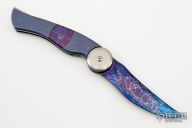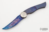This Custom High Roller by Jim Smyth features a Mosaic Blued Damascus blade with notched thumbrest. The handle has a large titanium rotating pivot, anodized titanium scales with blued mosaic Damascus inlays, titanium liners, Damascus backspacer. Nice detent, blade seating and lockup. Excellent condition.