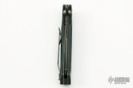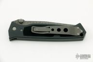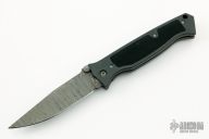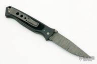 This Vallotton Chameleon D/A has a Damascus drop point blade with dual thumb studs and notched thumb rest. Handle is black anodized aluminum with non-slip inlay, titanium liners, lanyard, and titanium tip up clip. Auto blade release is via clip-to-scale button. Small ding in the pommel, otherwise excellent condition.
