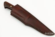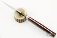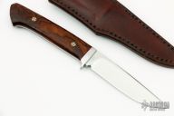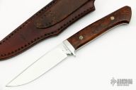 This Skinner by George Englebretson features a mirror polished blade with .131" blade stock and .870" blade depth, full tapered tang construction. The handle has a pinned stainless guard, red liners, wood scales, and mosaic pins. Filework on the spine. Comes with a leather sheath. Has a couple light scratches, otherwise excellent condition.