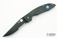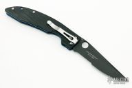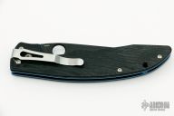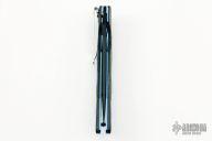 This Benchmade AFCK Limited Edition (17 of 250) linerlock folder has a black DLC M390 Stainless Steel clip point partially serrated blade with notched thumb rest and thumbhole. Handle is black G10 with anodized titanium liners, blue anodized titanium barrel spacers, lanyard hole, and tip down stainless steel clip. Excellent condition.