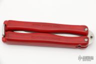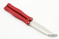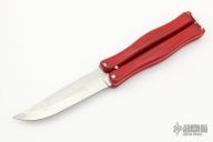 This Vintage CIA Balisong by Hackman has a satin finished stainless steel clip point blade. Handle is red polymer with O-latch at butt. Scratches are visible on the blade and handle otherwise the knife is in good condition.