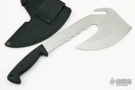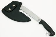 Wicked looking axe designed by Ken Warner and Mike Stewart of Blackjack Knives. Blade is .173" thick and about 7.5" cutting edge, has gut hook on back. 15.75" overall with a rubber handle. Comes with original sheath. Has some light scratches, otherwise excellent condition. Blade Steel: Aus8