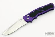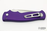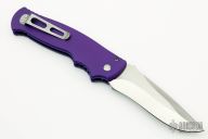This Triple Hollow Grind M2 by Walter Brend features a satin finished blade with triple hollow grind, notched thumbrest. "02/14" and X2 on blade. The handle is purple aluminum with non-slip inserts, tip up satin finished stainless steel clip. Comes with original box and zippered case. Excellent condition.