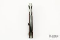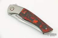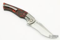 This Fury Flipper by Emmanuel Le Brun features a hand rub satin finish with fullers and flipper tab. The handle has a blasted titanium frame and backspacer, red/black fat carbon scales and pivot collars. Matching tip up clip. Very smooth. Nice detent, lockup and blade seating. Comes with original zippered case and COA. New from Maker!