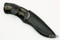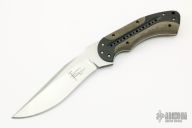 This "Crusader" fixed blade by Todd Begg features a hand rub satin finished clip point recurve blade with false top edge, notched thumbrest and finger rest, .233" blade stock and 1.378" blade depth, full tang construction. The handle has carbon fiber scales with black linen micarta inlays, has lanyard hole. Comes with black leather sheath. Excellent condition.