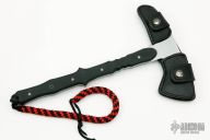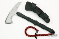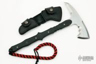 This Custom Tomahawk by Robert Hankins features a satin finished blade with full tang construction, all edges are sharpened that appear sharpened, .227" blade stock and 2.25" blade depth. Has black G-10 scales with a lanyard hole. Comes with a black leather sheath. Has a little light patina, otherwise excellent condition.