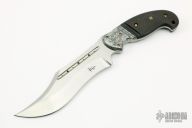 This Custom Bowie from Knife Makers Guild President Todd Begg features a hand rub satin finished blade with fullers and notched thumbrest, false top edge, .278" blade stock and 2" blade depth, full tapered tang construction. Jewel ice textured spine and tang. The handle has fluted mosaic Damascus bolsters, lightning strike carbon fiber scales with gold plated screws and mosaic pin, lanyard hole. Comes with zippered case. Excellent condition. PROTOTYPE