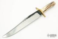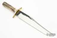 This Unforgiven Bowie by JP Moss features a hand rub satin finished blade with false top edge and hammered flats, visible temper line, .260" blade stock and 2.091" blade depth, hidden tang construction. The handle has a bronze guard and butt with stag grip. #25. Excellent condition.