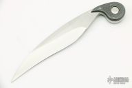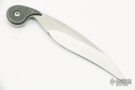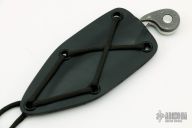 This neck knife by Jim Smyth features a hand rub satin finished blade with notched thumbrest and Damascus scales, .152" blade stock and .812" blade depth, full tang construction. Comes with a kydex neck sheath. Excellent condition. Comes with a velcro case.