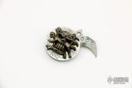 This dressed up coin knife by Warren Thomas features a chisel ground titanium blade. The handle has engraved stainless steel scales with anodized titanium spacer, skull overlays, one of which has ruby eyes. Comes with a leather spiral pouch that is pretty cool too. Excellent condition. Travis Walker of Double Cross Jewelry did the applications, less than 10 were made.