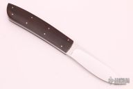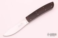 This knife by George Muller features a mirror polish drop point blade with .158" blade stock and .839" blade depth, full tapered tang construction. The handle has ebony scales and stainless steel pins.Comes with a leather sheath and box. Excellent condition.