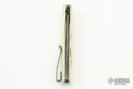 This Swayfront Persian Flipper by Brad Zinker features a Begas Forge Damascus blade with checkered thumbrest and flipper. The handle has mammoth ivory scales, anodized titanium liners with laser engraved interiors and a tip up anodized titanium clip. Rides on bearings, nice detent, lockup and blade seating. Comes with zippered case. New from maker!