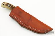 This skinner by John Young features a mirror finished blade with notched thumbrest, .137" blade stock and .972" blade depth, full tapered tang construction. The handle has engraved stainless steel guard, ram's horn scales with red liners and engraved pins. Comes with a brown leather sheath and zippered case. Has some light scratches on the blade, otherwise excellent condition.