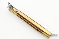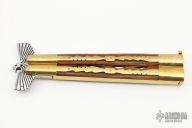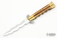 This balisong features a mirror polished Kris blade. The handle features brass bolsters and liners complimented by wood scales. Patina, scuffs and scratches are visible otherwise the knife is in good condition.