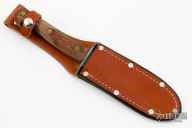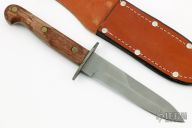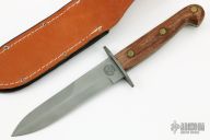 This Aussie Bowie by EK Knives features a bead blast finished blade with false top edge, .157" blade stock and 1.199" blade depth, full tang construction. The handle has a stainless steel guard and wood scales. Comes with a brown leather sheath. Has a couple light scuffs, otherwise excellent condition.