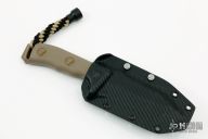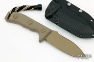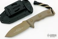 This Currahee by Microtech has a tan tanto blade with a standard edge and tan polymer scales. 3/16" blade stock and 1 1/2" blade depth, full tang construction. Dated 11/2019 and S/N 5093. Comes with kydex sheath with molle lock and original box. Excellent condition.