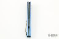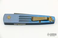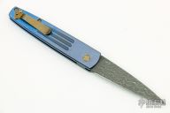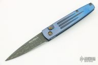 This Limited Edition Spike Auto by Benchmade features a Devon Thomas Raptilian Damascus blade. The handle has an anodized and orange peel finished titanium frame with a matching tip up clip and backspacer, safety on the spine. Comes with original box and COA dated Feb 10, 2011. Excellent condition.