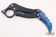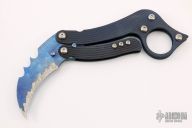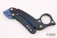 This balisong by Warren Thomas features a chisel ground finger print anodized titanium blade with carbidized edge. Lightweight with milled and anodized titanium handles. Excellent condition. Comes with a leather pouch.