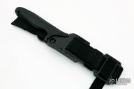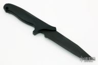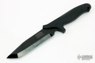 This Specwar Fixed Blade by Timberline Knives features a black-Ti Coated tanto chisel ground blade, @ 60 RC, 0.200" blade thickness and 1.393" blade depth. The handle is fiberglass reinforced nylon with a stainless steel butt plate for striking. Comes with original sheath and a zippered case. This collaboration between Ernie Emerson and Vaughn Neeley won "American Made Knife of the Year" at the 1995 Blade Show. Has some light scuffs and scratches, otherwise excellent condition. Hard to find.
