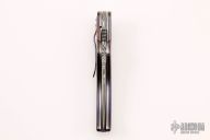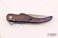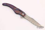 This liner lock flipper by Jim Smyth features a Damascus blade with notched thumbrest and flipper. The handle has timascus bolsters and scales, titanium liners, timascus tip down clip and backspacer. Smooth function, flipping requires no wrist action. Strong lock up, nice detent and blade seating. Very nice work. Excellent Condition. Comes with a zippered case.