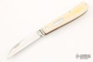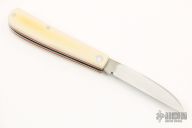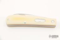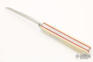 This Swayback Slipjoint by Rick Nowland features a wharncliffe blade with hand rub satin finish and nail nick. The handle Westinghouse ivory paper micarta covers with red liners and a stainless steel escutcheon, stainless steel liners and spring. Has half-stop. New from maker at the 2022 Blade Show Texas. Includes a zippered case.