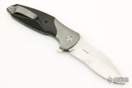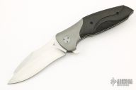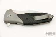 This Reflex Flipper by Jeremy Krammes features a hand rub satin finished recurve blade with a flipper. The handle has bead blasted titanium bolster, carbon fiber scales that have been carved and stippled, bead blasted titanium liners, tip up clip and a fileworked titanium backspacer. Nice detent, lockup and blade seating. Excellent condition.
