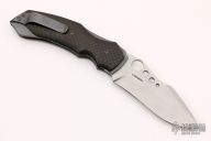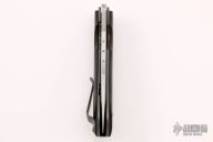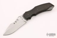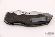 This Apoc linerlock folder by Jeremy Krammes features a bead blast finished blade with ball bearing inlays on the spine, thumbhole as well as accent holes in the blade, harpoon style swedge. The handle has carbon fiber scales, bead blasted titanium liners and tip up clip, black G-10 backspacer. Nice detent, blade seating and lockup. Excellent condition.