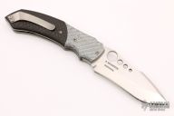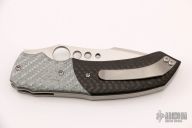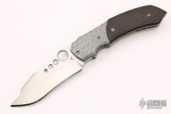This Apoc linerlock folder by Jeremy Krammes features a hand rub satin finished blade with thumbhole as well as accent holes in the blade, harpoon style swedge. The handle has silver twill bolsters, carbon fiber scales, bead blasted titanium liners, tip up clip and backspacer. Nice detent, blade seating and lockup. Excellent condition.