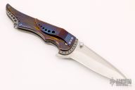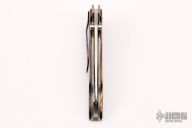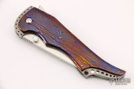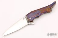 This Bad Attitude linerlock flipper by Jim Smyth features a hand rubbed satin finished blade with dual thumbstuds that have mother of pearl inlays, notched thumbrest and flipper. The handle has Timascus scales, bead blasted titanium liners and backspacers, tip down anodized titanium. Nice lockup and blade seating. Excellent condition.