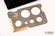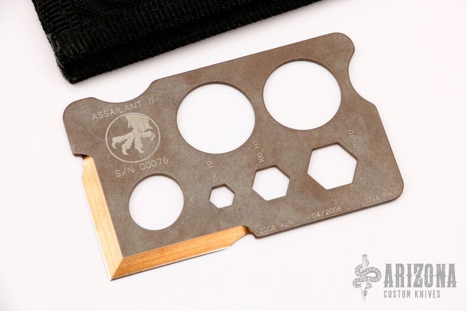This Assailant Credit Card Knife #00076 and 04/2008 has a chisel ground blade and matte finished anodized stainless steel frame. Excellent/ unused condition. Comes with original Microtech wallet.