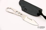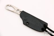 This mid-tech neck knife by Rob Simonich features a clip point satin finished Talonite blade with notched thumbrest, .127" blade stock and .619" blade depth, integral construction. The handle is skeletonized. Comes with kydex neck sheath. Excellent condition.