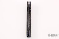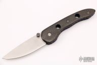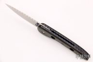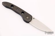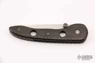 This Linerlock by Jim Smyth features a bead blasted blade with single thumbstud and fileworked spine. The handle has carbon fiber scales with fileworked screws, fileworked and anodized titanium liners, carbon fiber backspacer. Excellent condition. .68" bladestock.