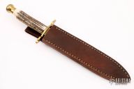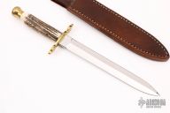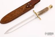 This Dagger by Steve Voorhis features a mirror polished double edged blade with .193" blade stock and 1.075" blade depth, hidden tang construction. The handle has a brass guard and pommel and a stag grip. Excellent work. Great fit and finish. Has some light scratches, otherwise excellent condition. Comes with a brown leather sheath.