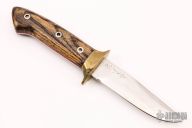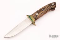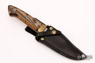 This Chute Knife by Floyd E Medlin features a clip point blade with .124" blade stock and 1.047" blade depth, full tang construction. The handle has brass guard with pack scales and red liners. Comes with a black leather sheath. Has some scratches and patina, otherwise good condition.
