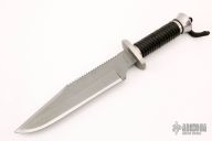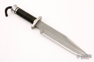 This Survival Bowie by Jim Thompson features a bead blasted blade with sawteeth on the spine, .243" blade stock and 1.983" blade depth, hidden tang construction. The handle has a stainless steel guard and removable butt cap, stainless steel hollow handle with black ribbed grip. Has some light scratches and stains, otherwise good condition.