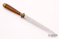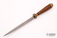 This Dagger by Victor Anselmo (who worked under John N Cooper) features a satin finished triangle dagger blade with .375" blade stock and blade depth, hidden tang construction. The handle has brass guard and butt with wood grip and black/orange spacers. Excellent condition.