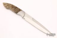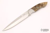 This Fighter by Ron Gaston features a double edged blade with hand rubbed satin finish, .179" blade stock and 1.253" blade depth, full tapered tang construction. The handle is comprised of dovetailed stainless steel bolsters, burl wood scales with red fiber liners. Excellent condition.