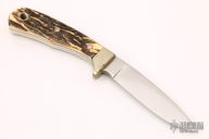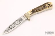 This knife by Aurum Etchings features a mirror polished drop point blade with etching, .171" blade stock and .831" blade depth, full tang construction. The handle has a nickel silver guard and stag scales with lanyard hole. Has a little patina on the nickle silver, otherwise excellent condition.