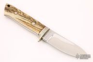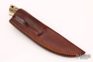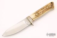 This Hunter by Dan Stranahan features a mirror finished blade with .205" blade stock and 1.178" blade depth, full tapered tang construction. The handle has a nickel silver guard, stag scales with red liners. Comes with a brown leather sheath. Has a few light scratches, otherwise excellent condition.