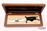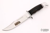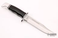 This Model 120 by Buck Knives features a satin finished clip point blade with false top edge and fullers, .175" blade stock and 1.066" blade depth, hidden tang construction. The handle has an aluminum guard and butt, and a black grip. Comes with original wooden display box. Excellent condition.