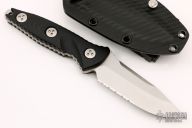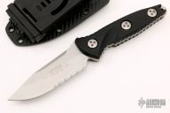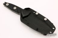 This Mini Socom Alpha by Microtech features a stonewashed drop point blade with partial serrations, a notched thumb ramp and a full tang construction. .162" Blade Stock. 1.151" Blade Depth. The handle features black G10 scales. Includes a kydex sheath with a Tek-lok. Dated 01/2022.  S/N 2646. Excellent Condition.