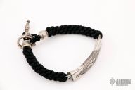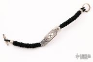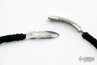 This Bracelet with Hidden Dagger by Hidetoshi Nakayama features a hand rub satin finished chisel ground single edged curved blade. The sheath is carved sterling silver with a titanium spring latch that holds the knife in place. Both are attached to braided cord bracelet with sterling silver ring clasp. The blade can be slide into the body and hidden away, or you can release it by pushing down on the bracelet end and pulling. Excellent condition. Very clever little piece. Few people have the imagination Hidetoshi Nakayama does!