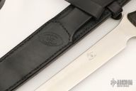 This AK-47 by Busse Knives features a satin finished blade with large choil, .179" blade stock and 1.302" blade depth, full tang construction. The handle has black paper micarta scales with hollow tube pins. Comes with a custom black leather sheath with shoulder rig. Excellent condition.
