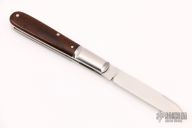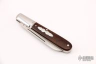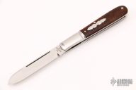 This Slipjoint by TA Davison features a hand rub satin finished drop point blade with a long pull nail nick. The handle has fluted integral stainless steel bolsters, burl covers with stainless steel escutcheon, stainless steel liners, stainless steel spring. Comes with zippered case. Has half-stop, flush in all positions. Excellent condition.
