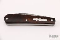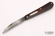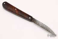 This Swayback by JH Lloyd features a Damascus wharncliffe blade with nail nick. The handle has burl covers with stainless steel escutcheon, liners and spring. Has half-stop, flush in all positions. Comes with zippered case. Light oxidation is visible on the blade otherwise the knife is in good condition.