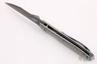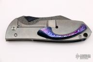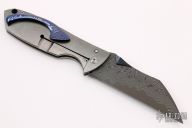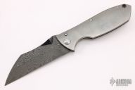 This XL Wench frame lock by Jeremy Marsh features a San Mai Damascus blade with dual MokuTi thumb lugs. The handle has a tumble finished titanium frame with MokuTi backspacer and sculpted tip up clip with hidden screws. Nice detent, lockup and blade seating. Excellent condition. Comes with a velcro case. Dated 03/2016