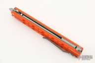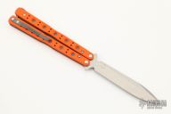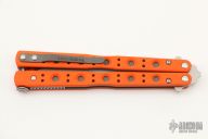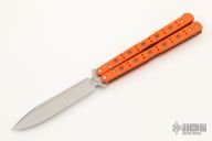 This Model 51 Morpho Balisong from Benchmade has a satin finished D2 stainless steel spear point blade. Handle is orange G10 with beadblast liners and matching titanium tip up clip. Comes with a drawstring pouch. Excellent condition.